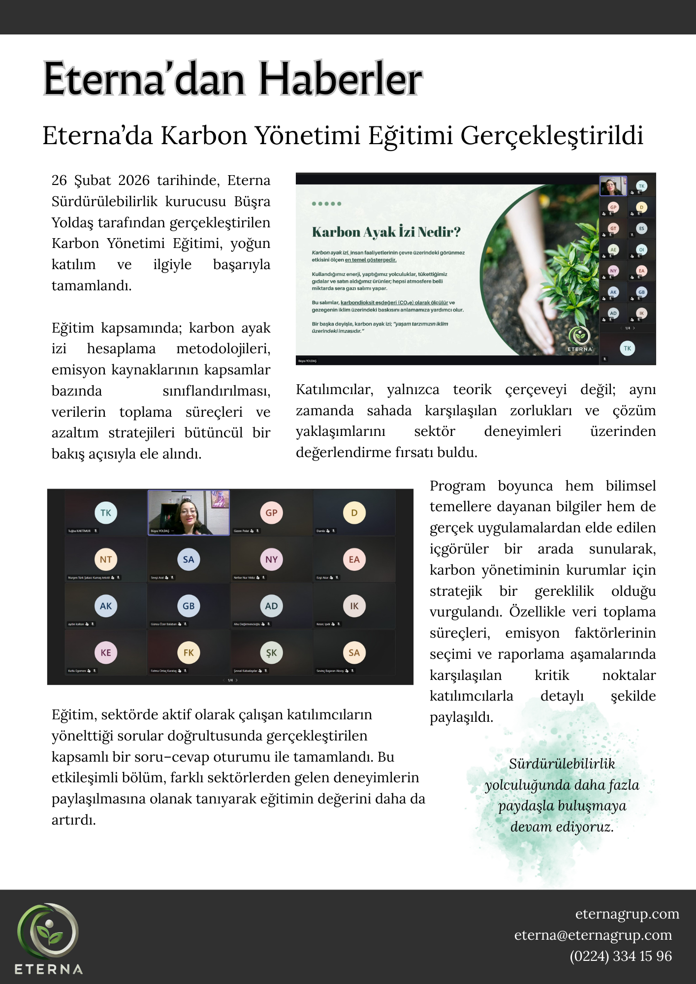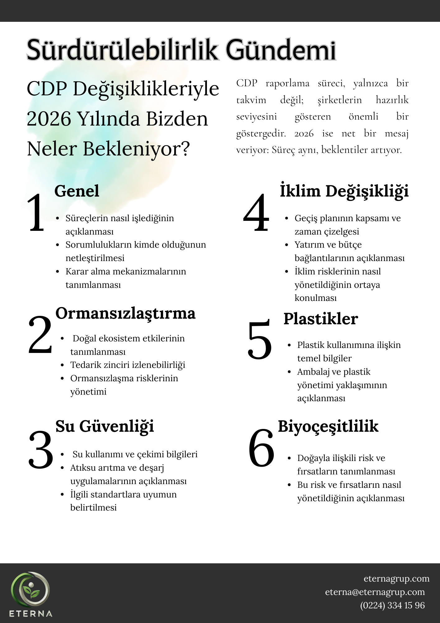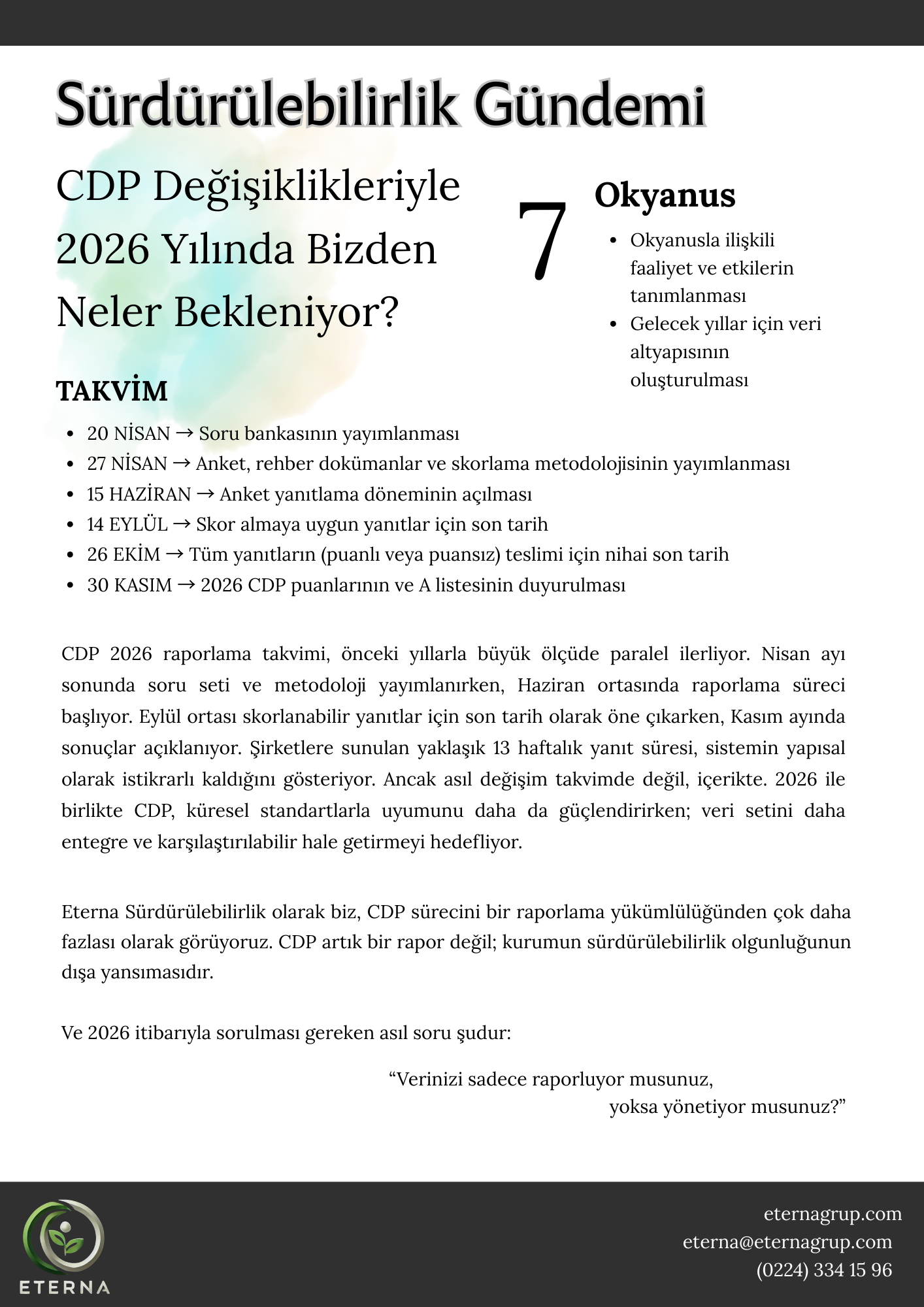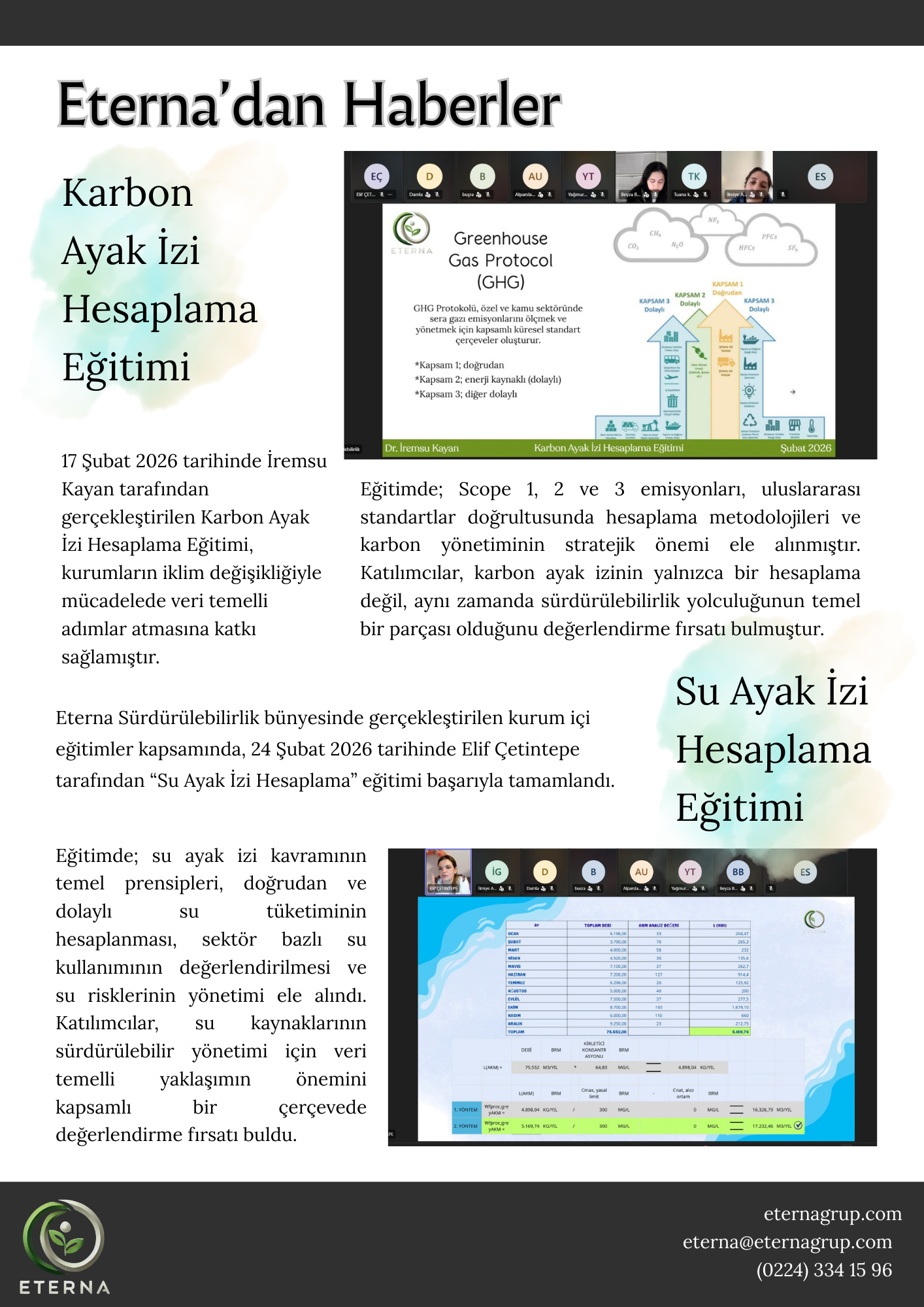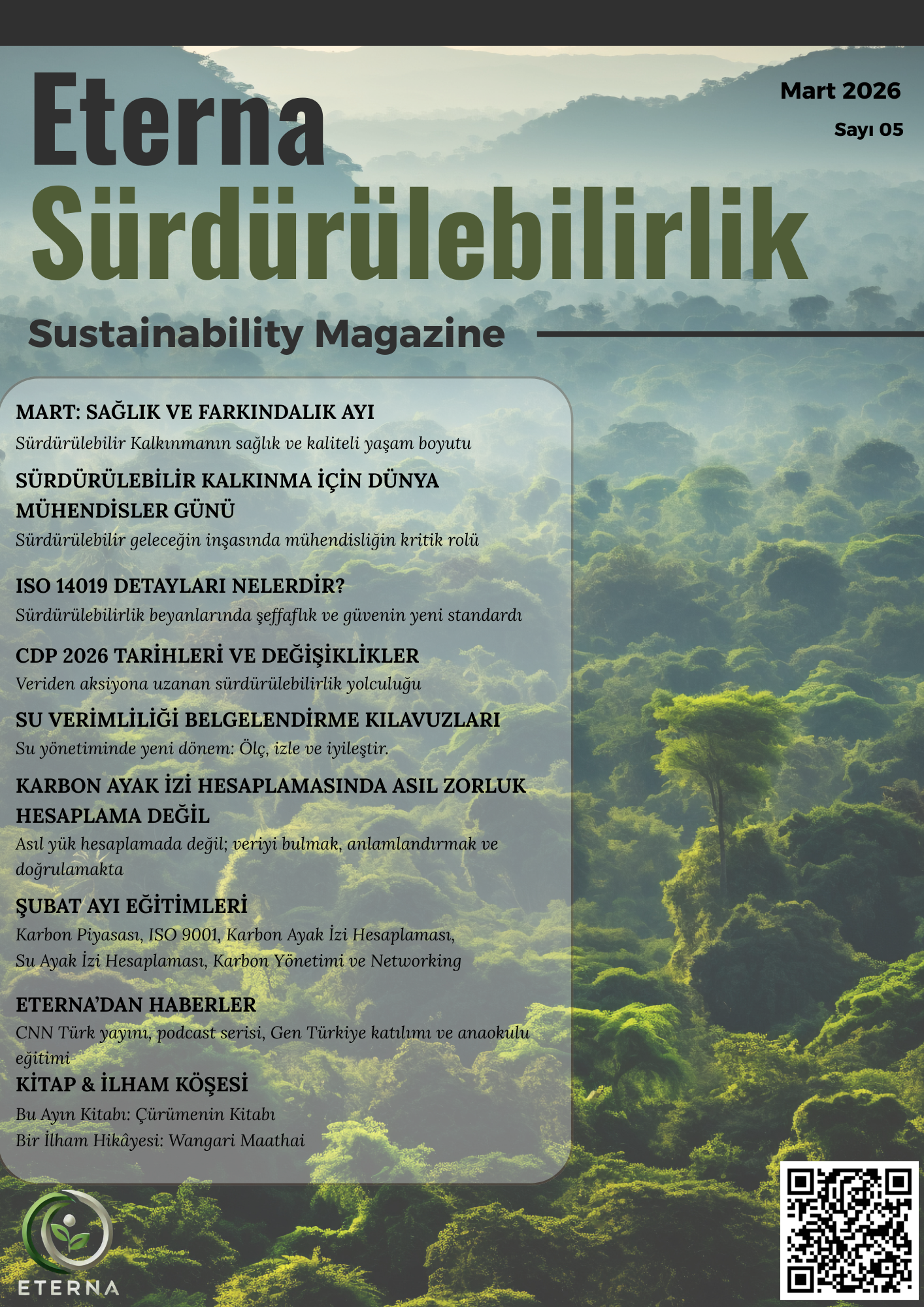 Bu sayıda; su verimliliği, CDP 2026 güncellemeleri, ISO 14019, karbon yönetimi ve sürdürülebilirlik gündeminin öne çıkan başlıklarının yanı sıra Eterna olarak gerçekleştirdiğimiz çalışmalara da yer verdik.