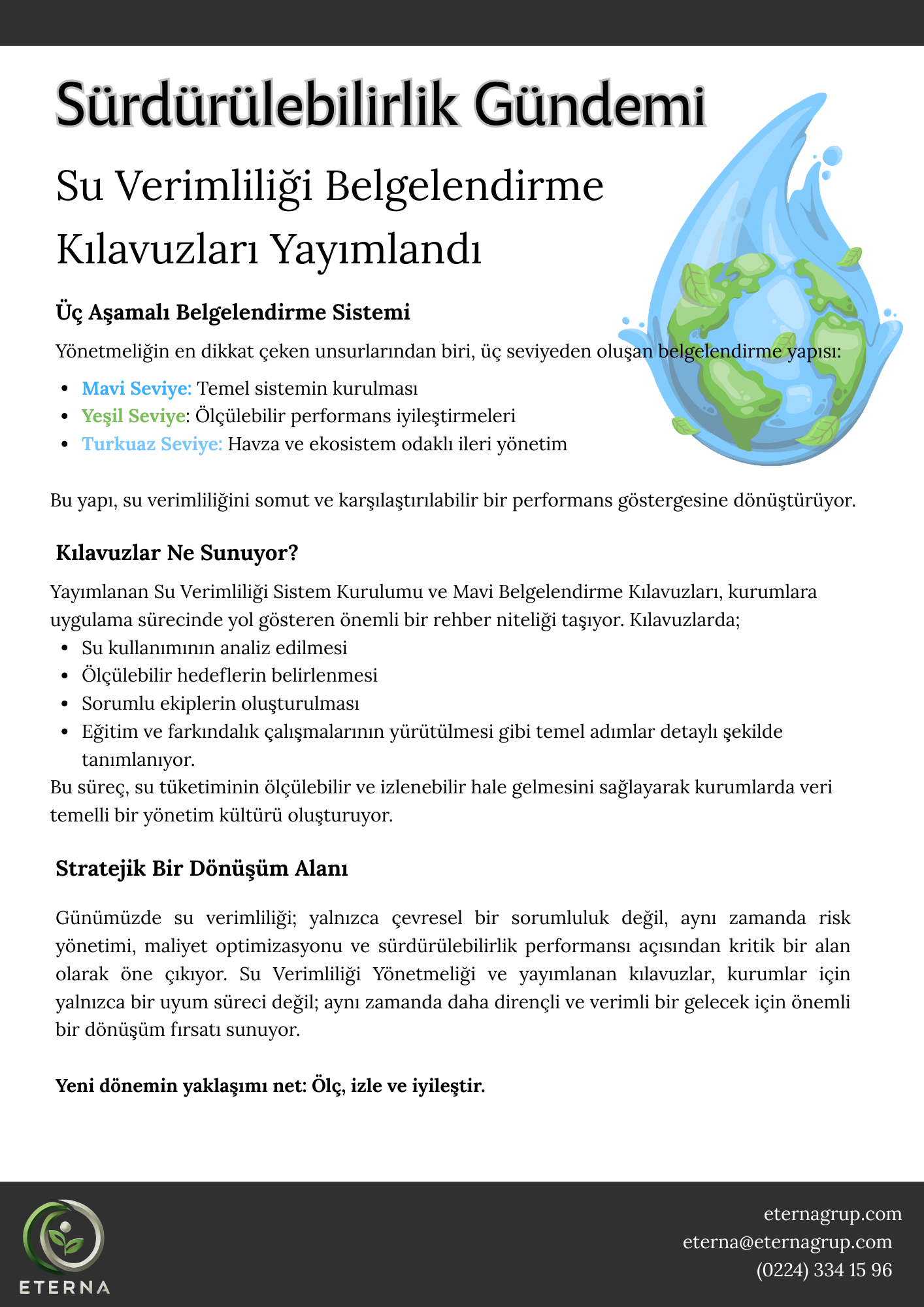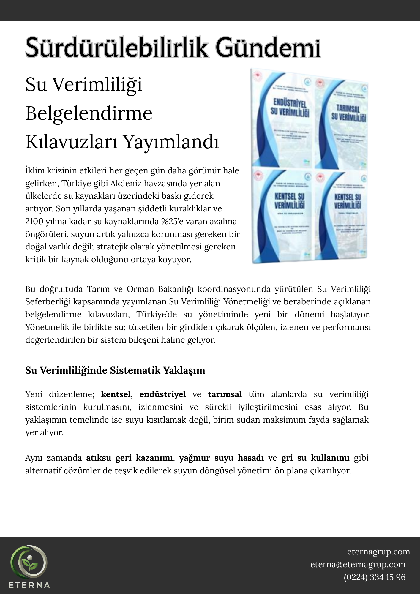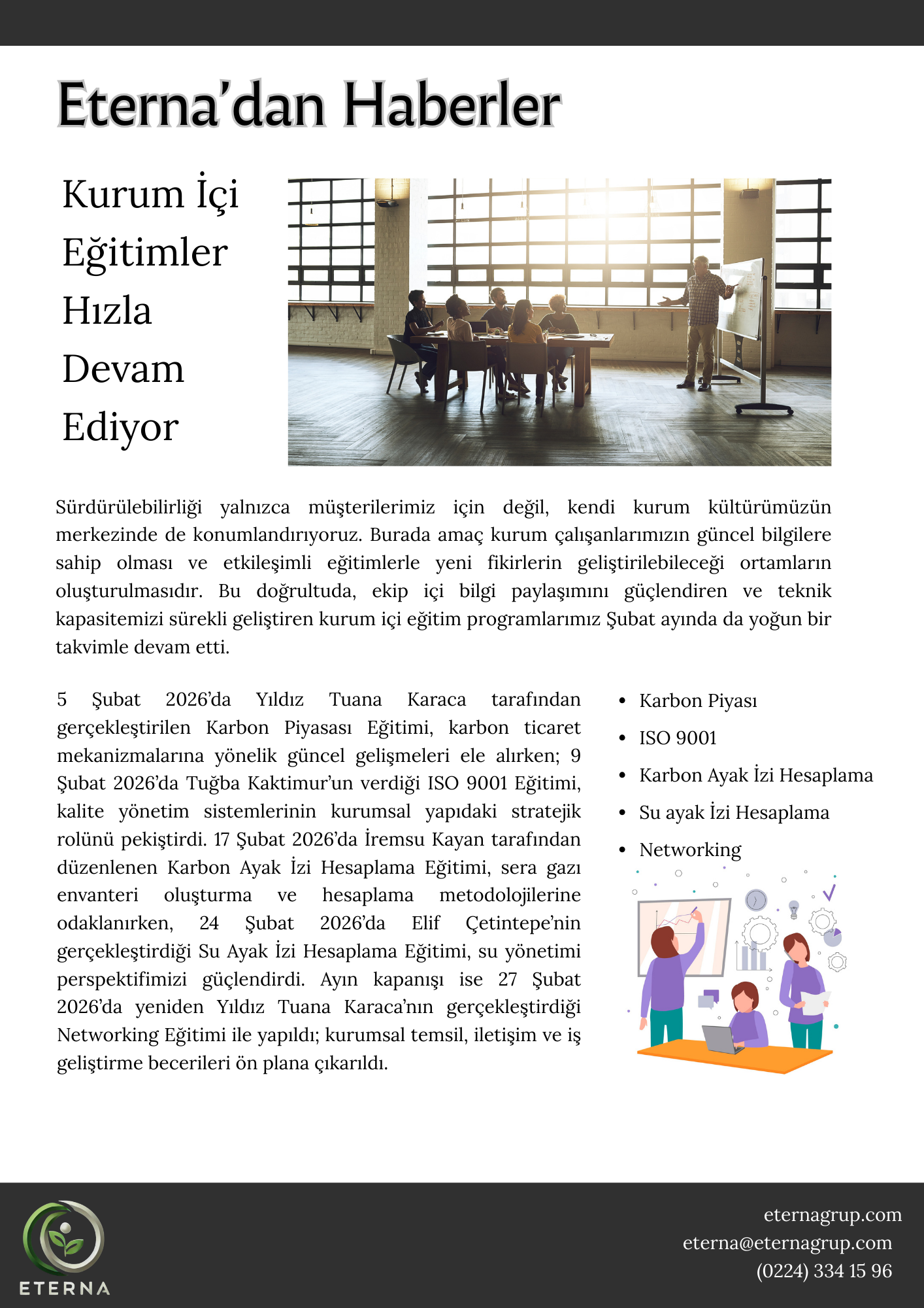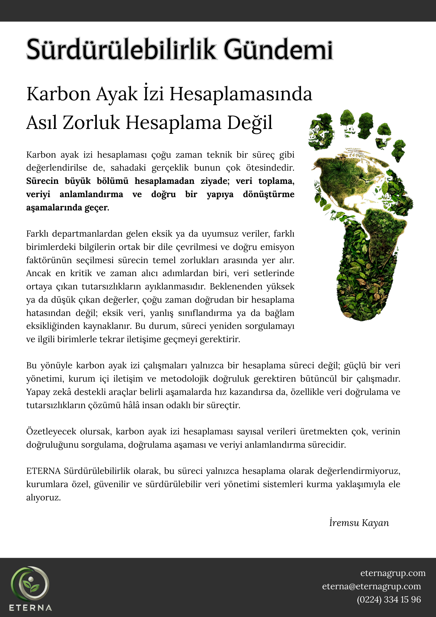 Bu sayıda; su verimliliği, CDP 2026 güncellemeleri, ISO 14019, karbon yönetimi ve sürdürülebilirlik gündeminin öne çıkan başlıklarının yanı sıra Eterna olarak gerçekleştirdiğimiz çalışmalara da yer verdik.