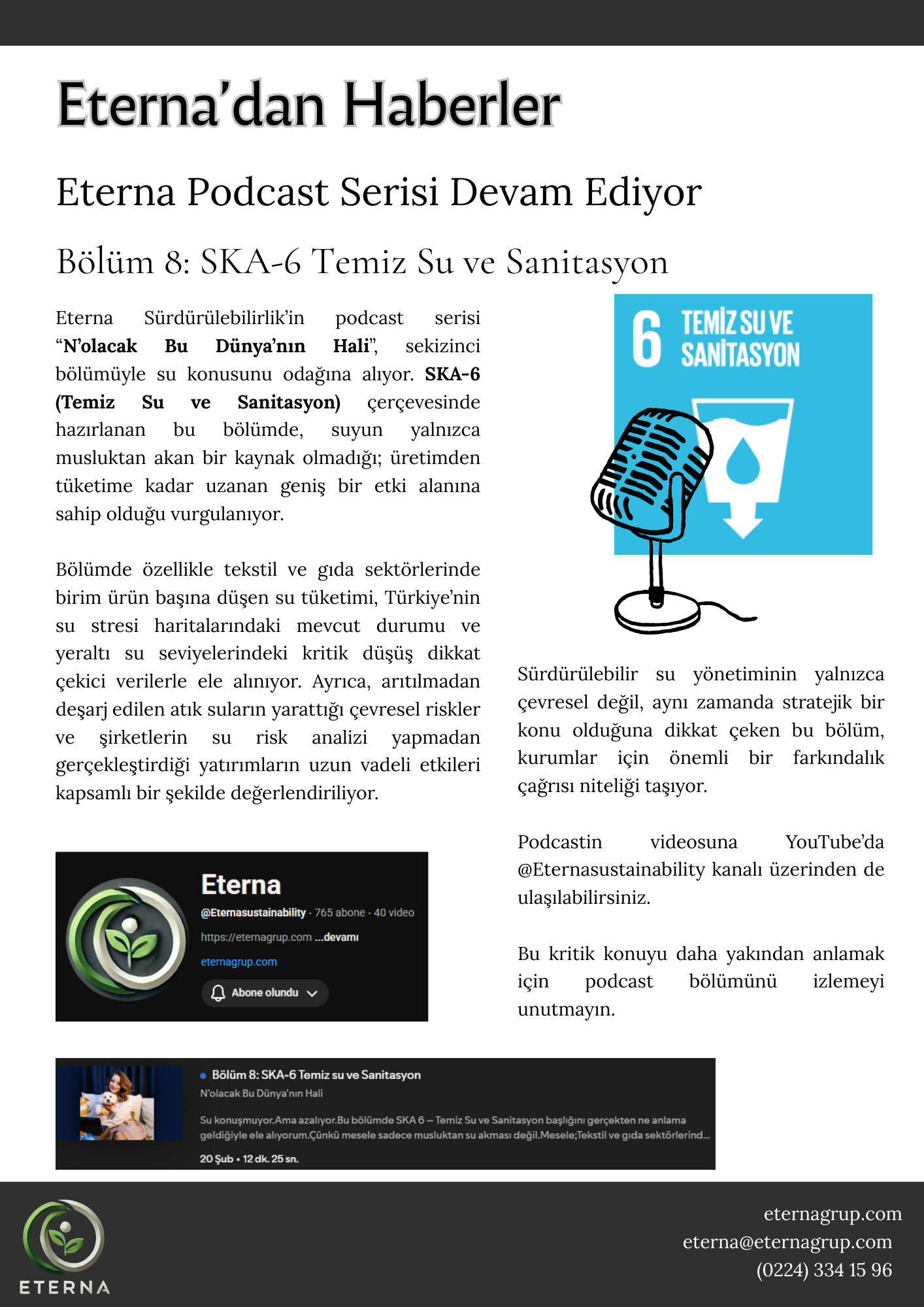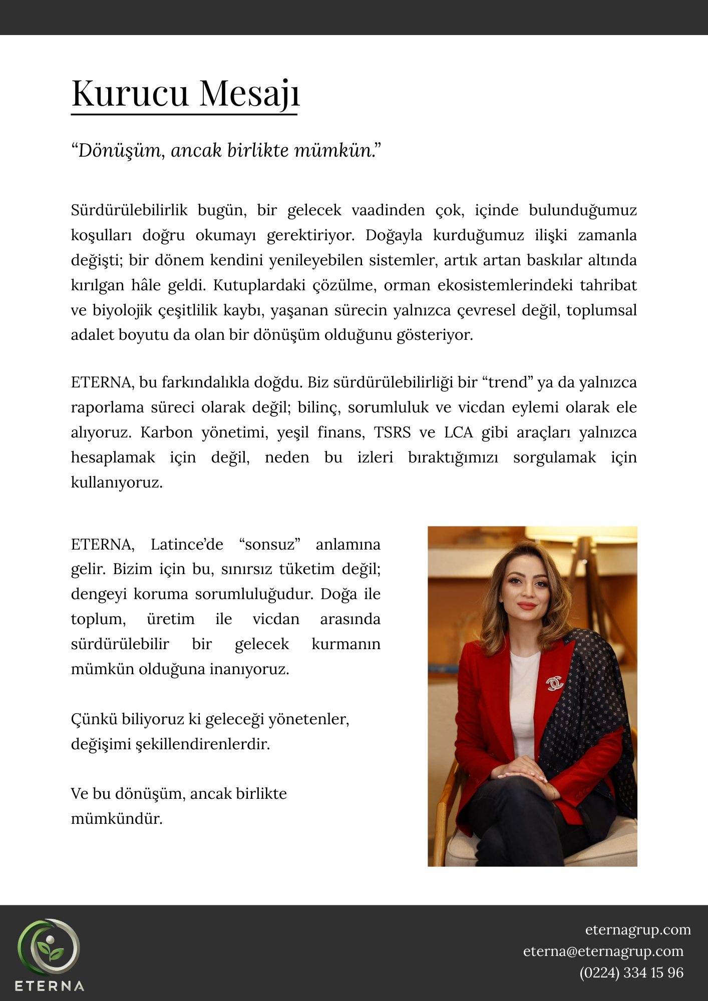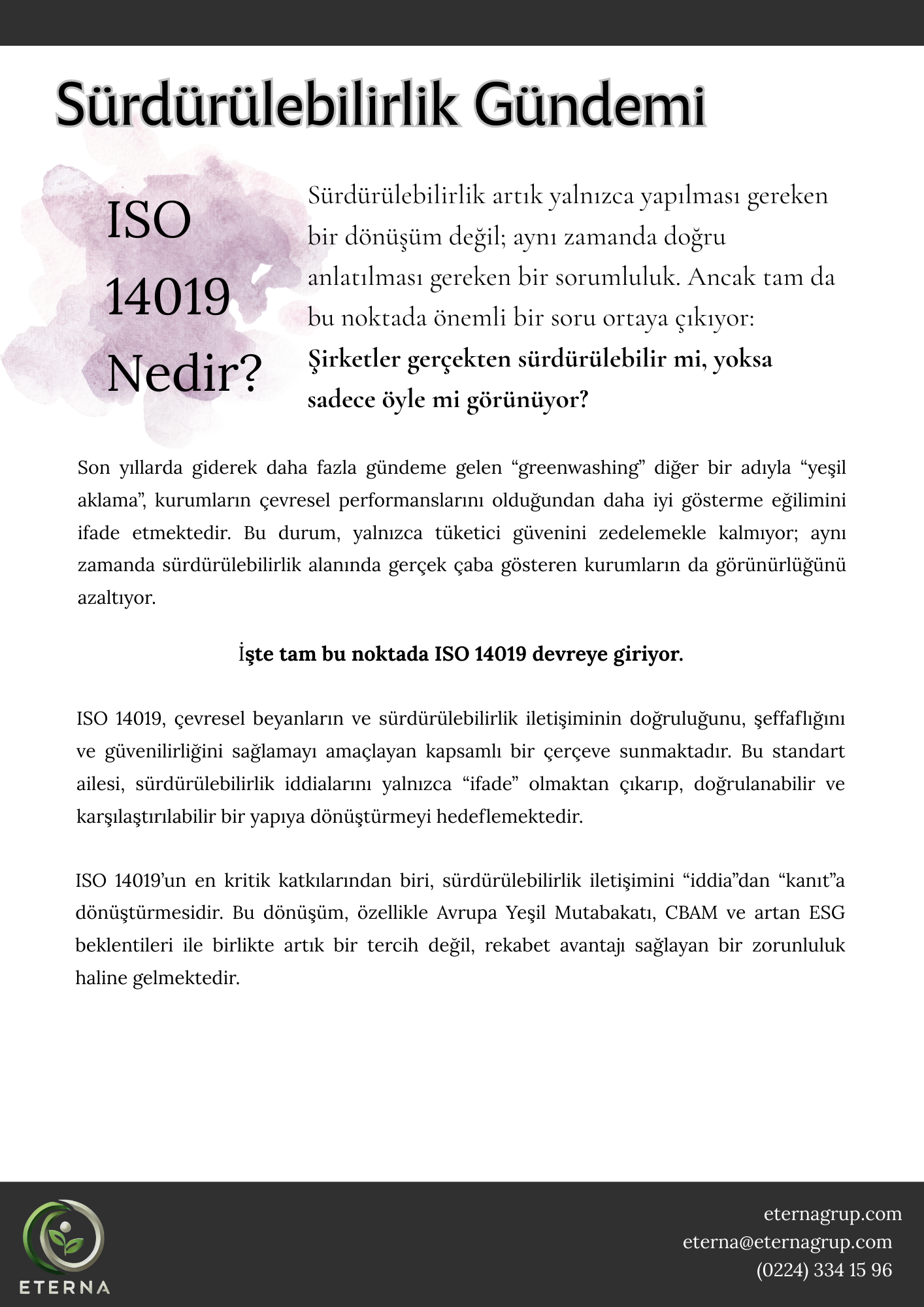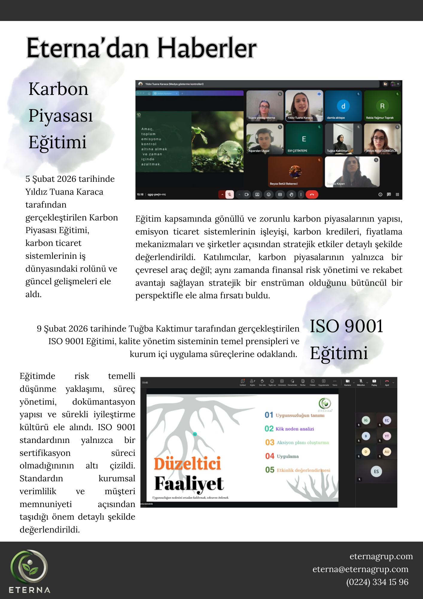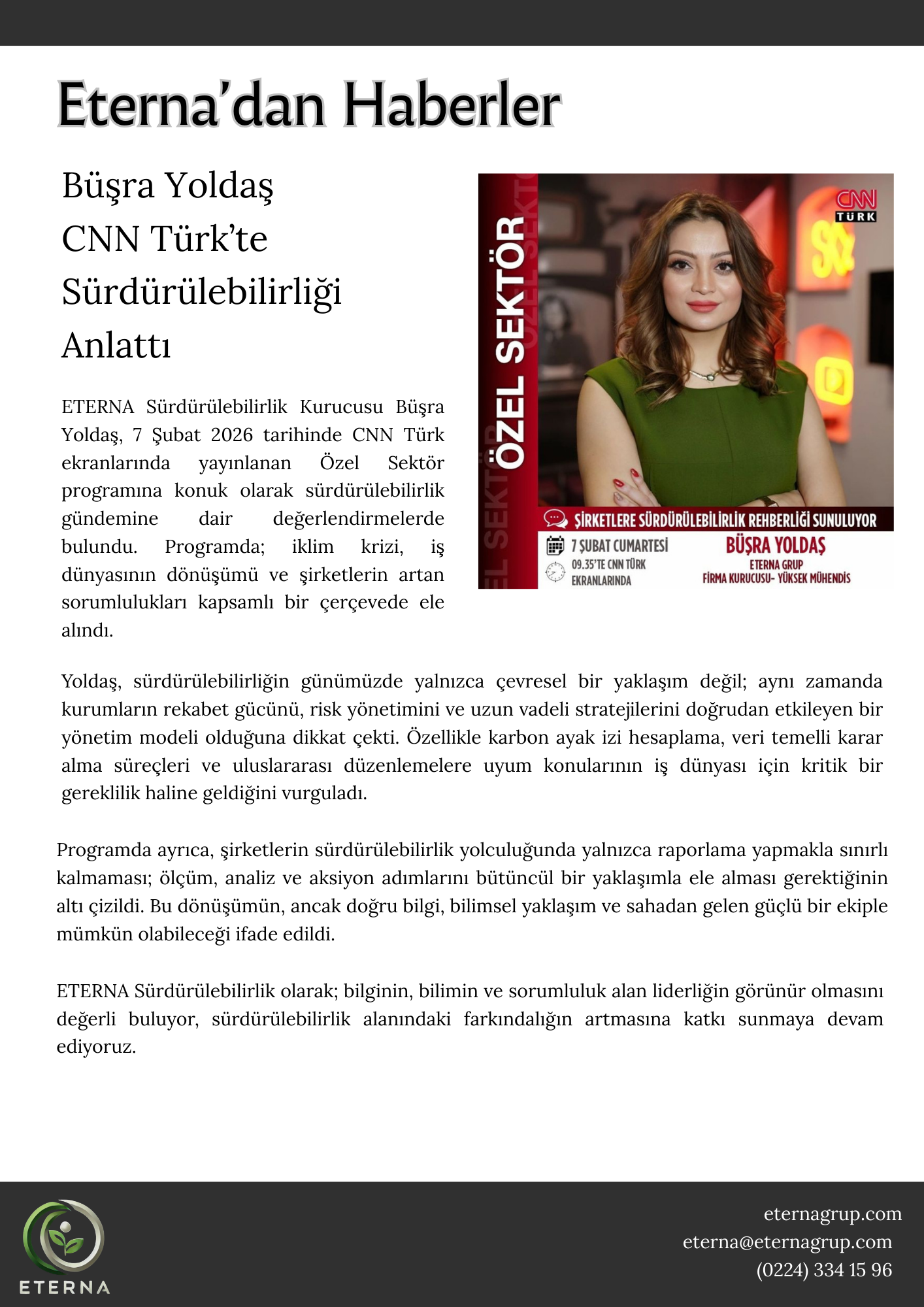 Bu sayıda; su verimliliği, CDP 2026 güncellemeleri, ISO 14019, karbon yönetimi ve sürdürülebilirlik gündeminin öne çıkan başlıklarının yanı sıra Eterna olarak gerçekleştirdiğimiz çalışmalara da yer verdik.