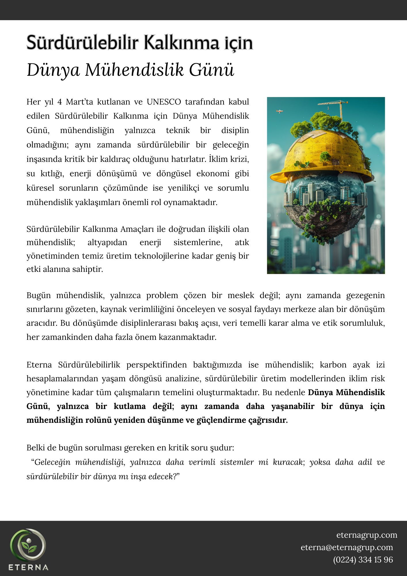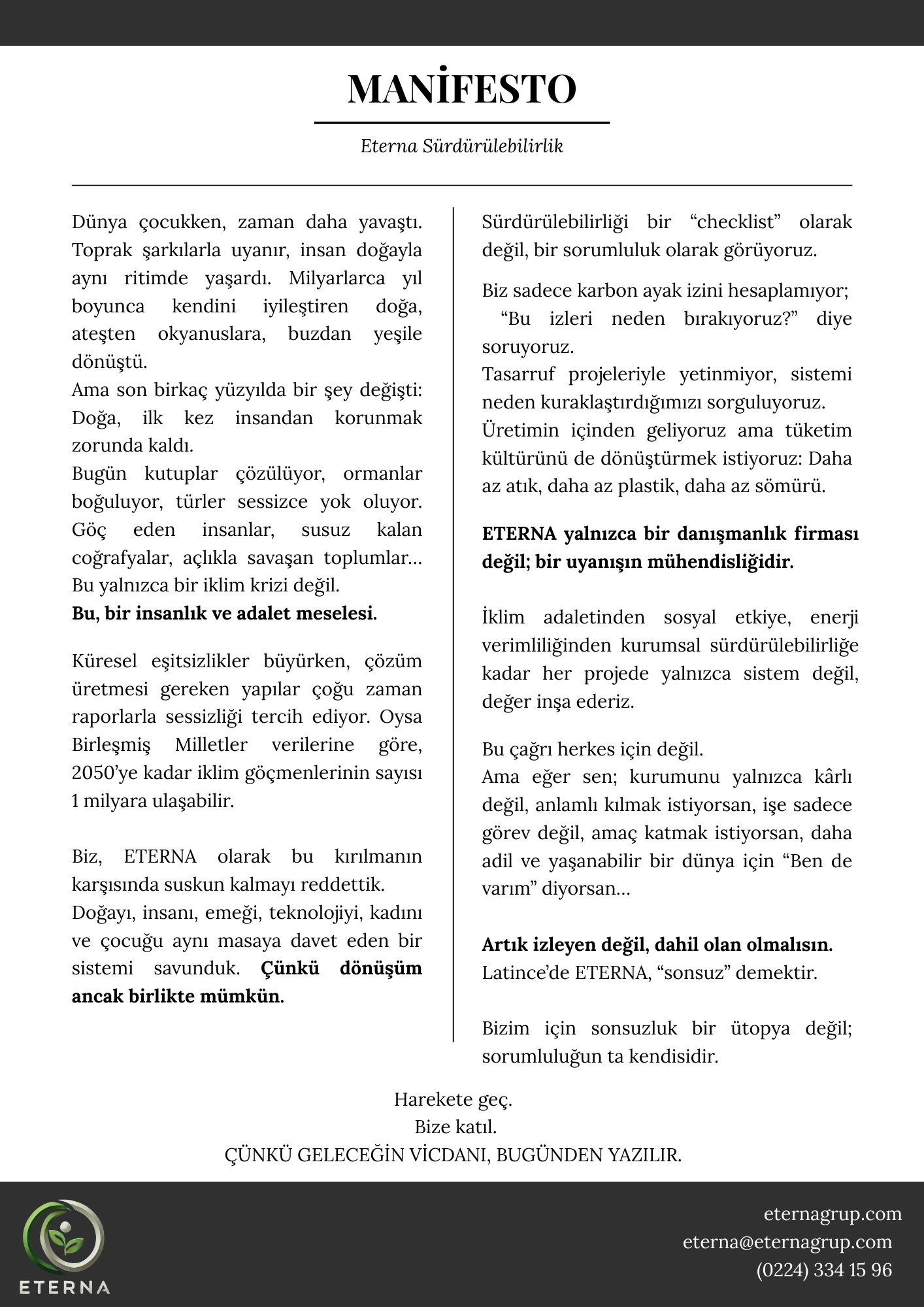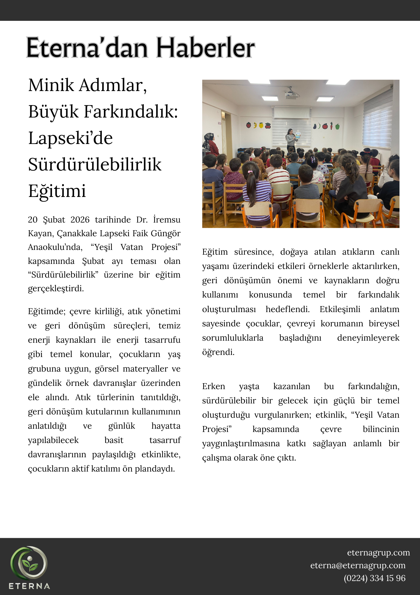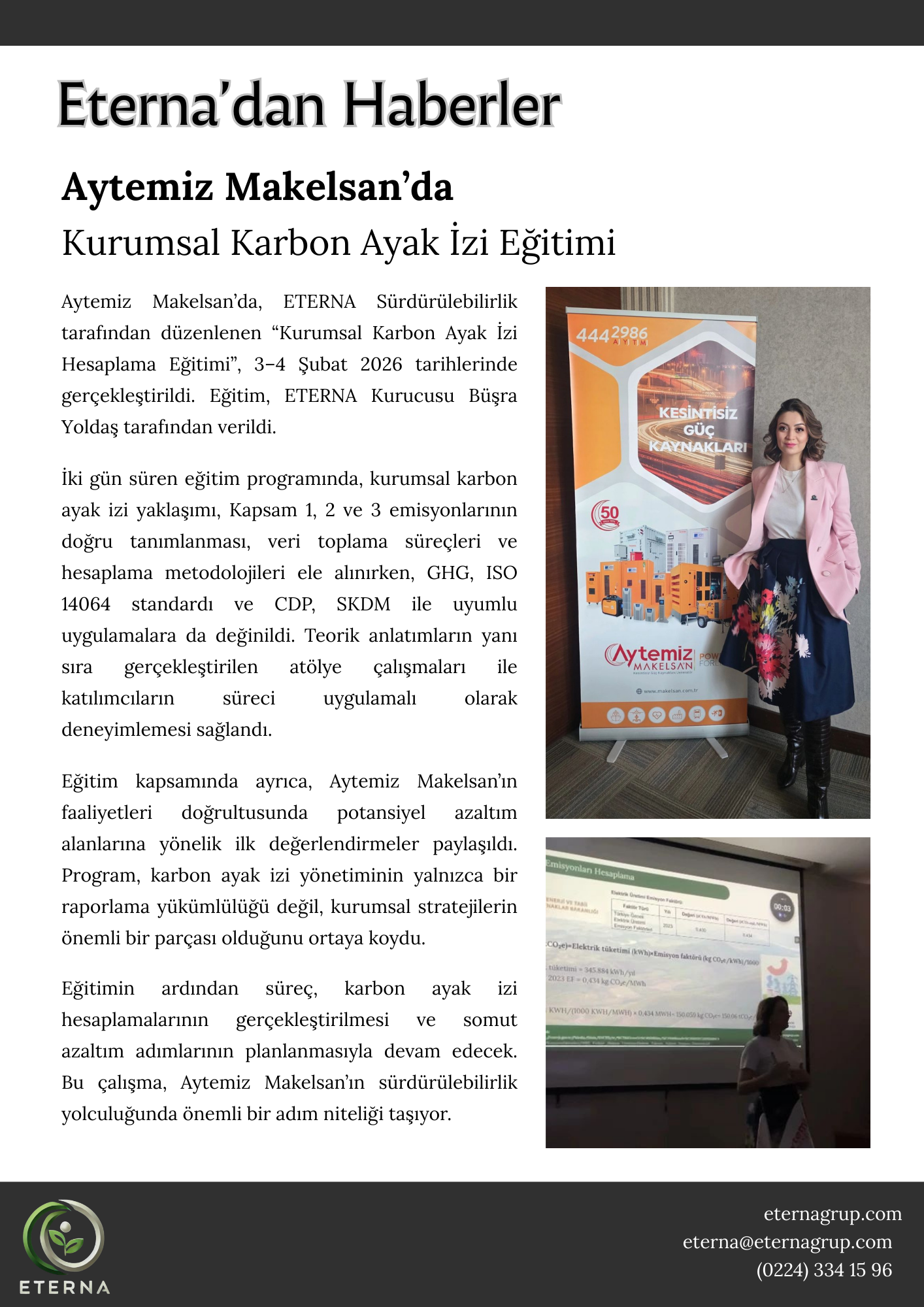Bu sayıda; su verimliliği, CDP 2026 güncellemeleri, ISO 14019, karbon yönetimi ve sürdürülebilirlik gündeminin öne çıkan başlıklarının yanı sıra Eterna olarak gerçekleştirdiğimiz çalışmalara da yer verdik.